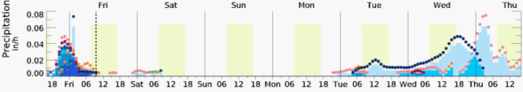 While snow levels are expected to drop below 1,000 feet in areas north of Seattle on Saturday afternoon and to 500 feet or less by Saturday evening, the forecast chance of precipitation in Whatcom County is at or near 0% across all computer weather model forecast ensembles.